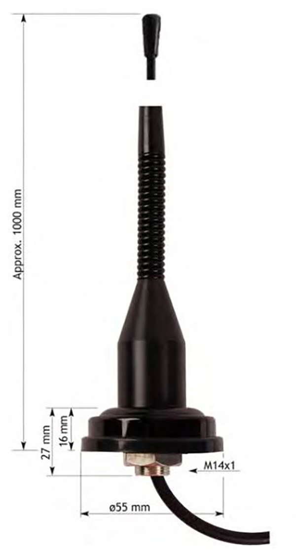radiation, completely independent of the mounting area. - Permanently attached 5 m RG 58 cable with FME(female) connector.