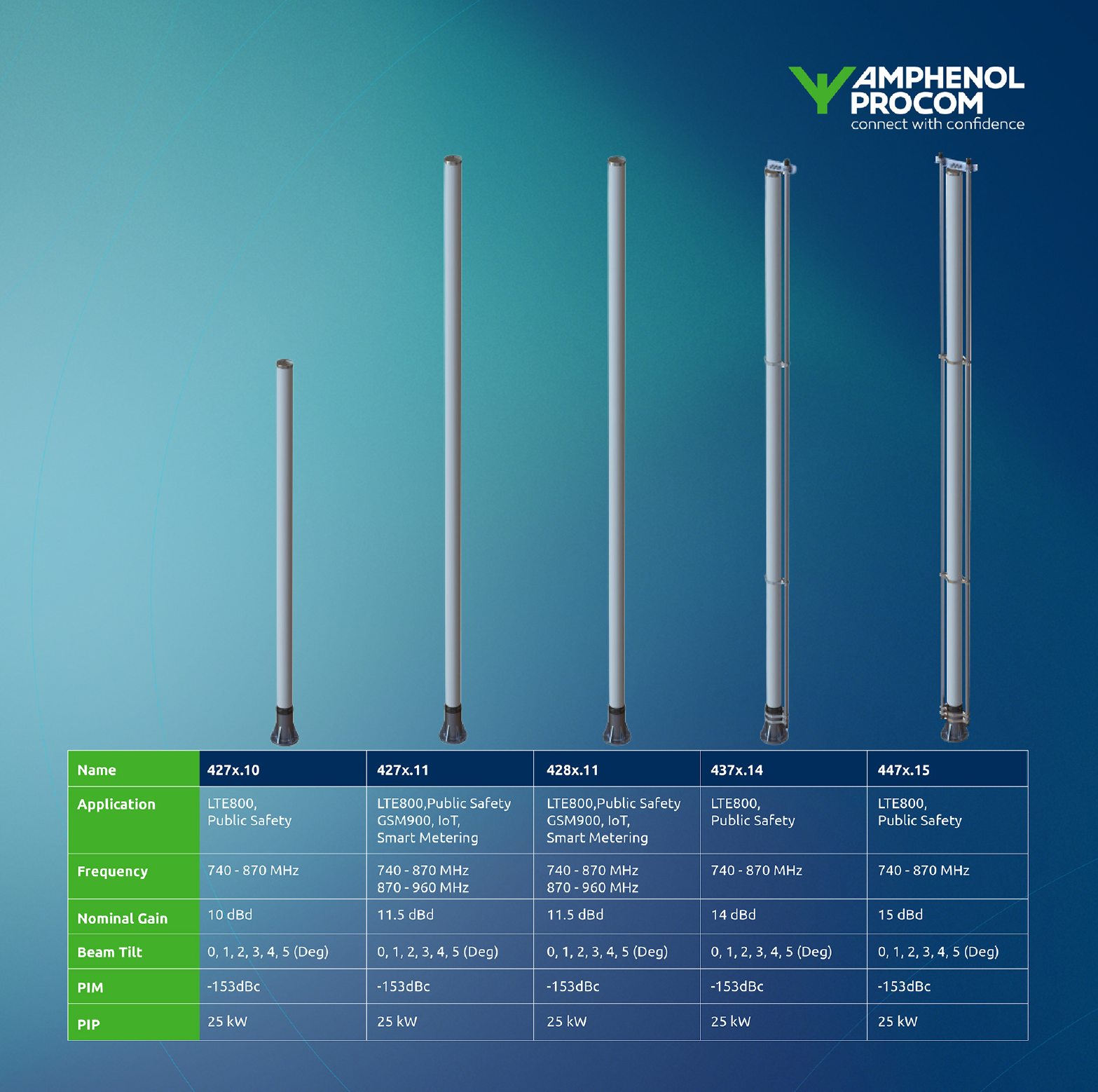 The 427x and 428x colinear antennas target sites where pattern stability, low PIM, and high PIP tolerance are mandatory. Both families use a centre-fed dipole array with a controlled feed network. This keeps the radiation pattern consistent across the operating band and prevents distortion when electrical tilt is applied.