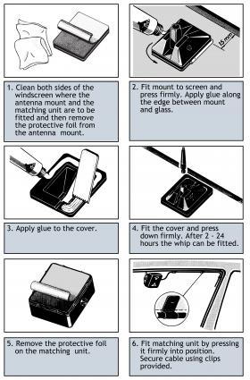 - Allow the silicone gluings to dry off 2 hours at a temperature above 15° C. To ensure full strength of the glue, it is recommended to keep the whip off the mount for 24 hours.
